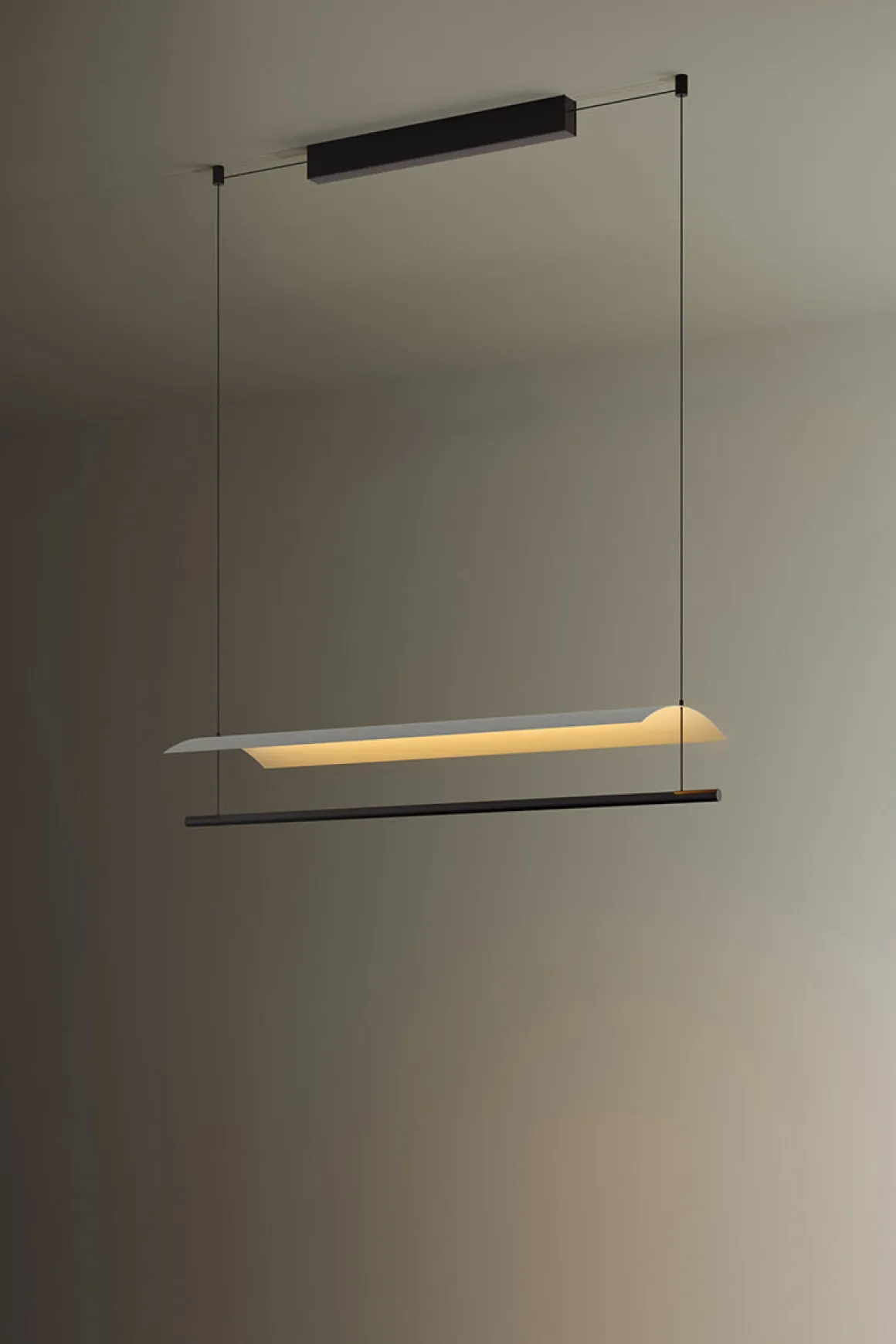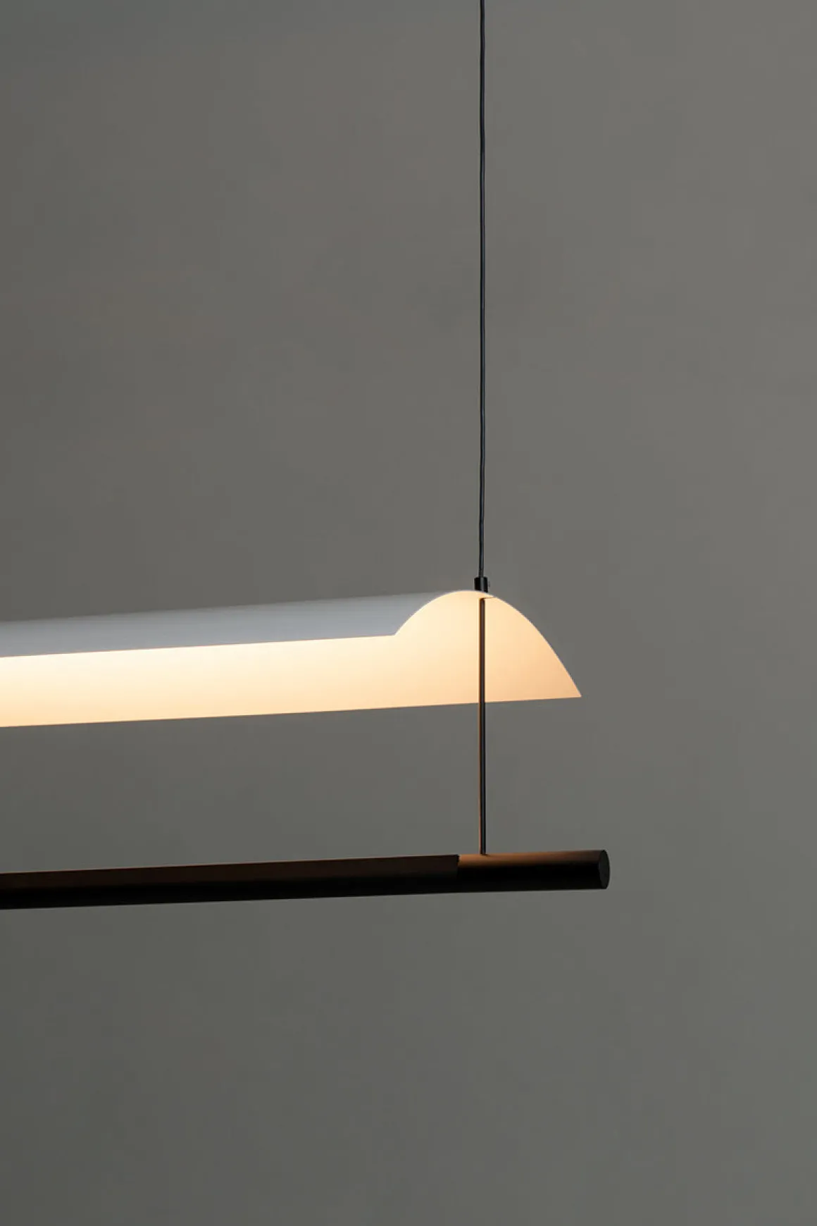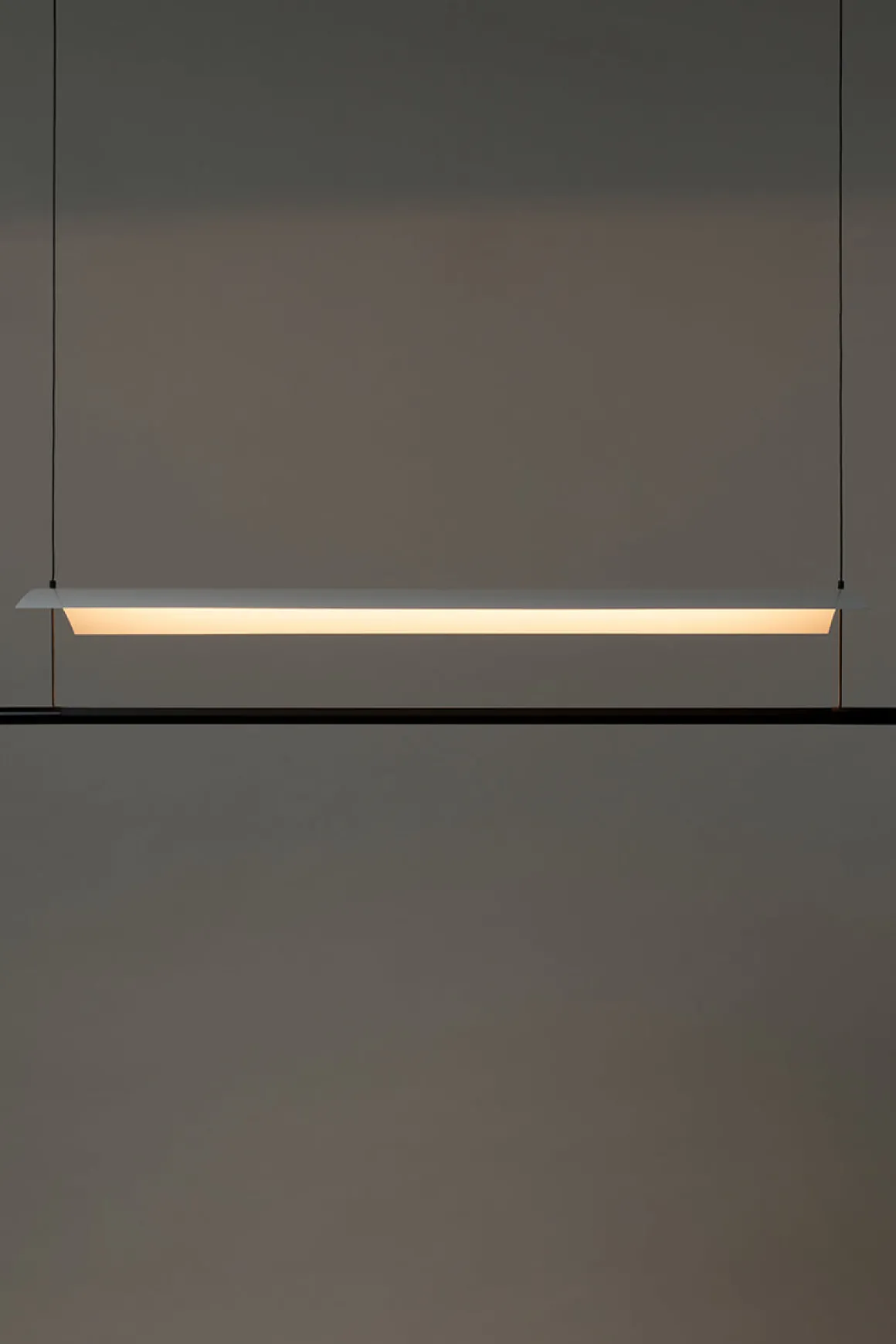 Lámina 85 fra Santa u0026amp; Cole, designet av Antoni Arola i 2018, er et uttrykk for balansen mellom poesi og funksjonalitet. Med en enkel linje av lys kombinert med et tynt metallskjold, skaper denne pendellampen en mild, reflektert belysning som løfter rommets atmosfære uten å være overveldende. Det minimalistiske designet gir et ærlig uttrykk – det skjuler ingenting, men fremhever alt, fra lys til form. Lámina-systemet er tilgjengelig i ulike formater og med ulike nyanser, noe som gjør det fleksibelt for både hjemlige og profesjonelle miljøer. Lampens lette og tidløse design viser Santa u0026amp; Coles evne til å skape belysning som både er estetisk tiltalende og praktisk.