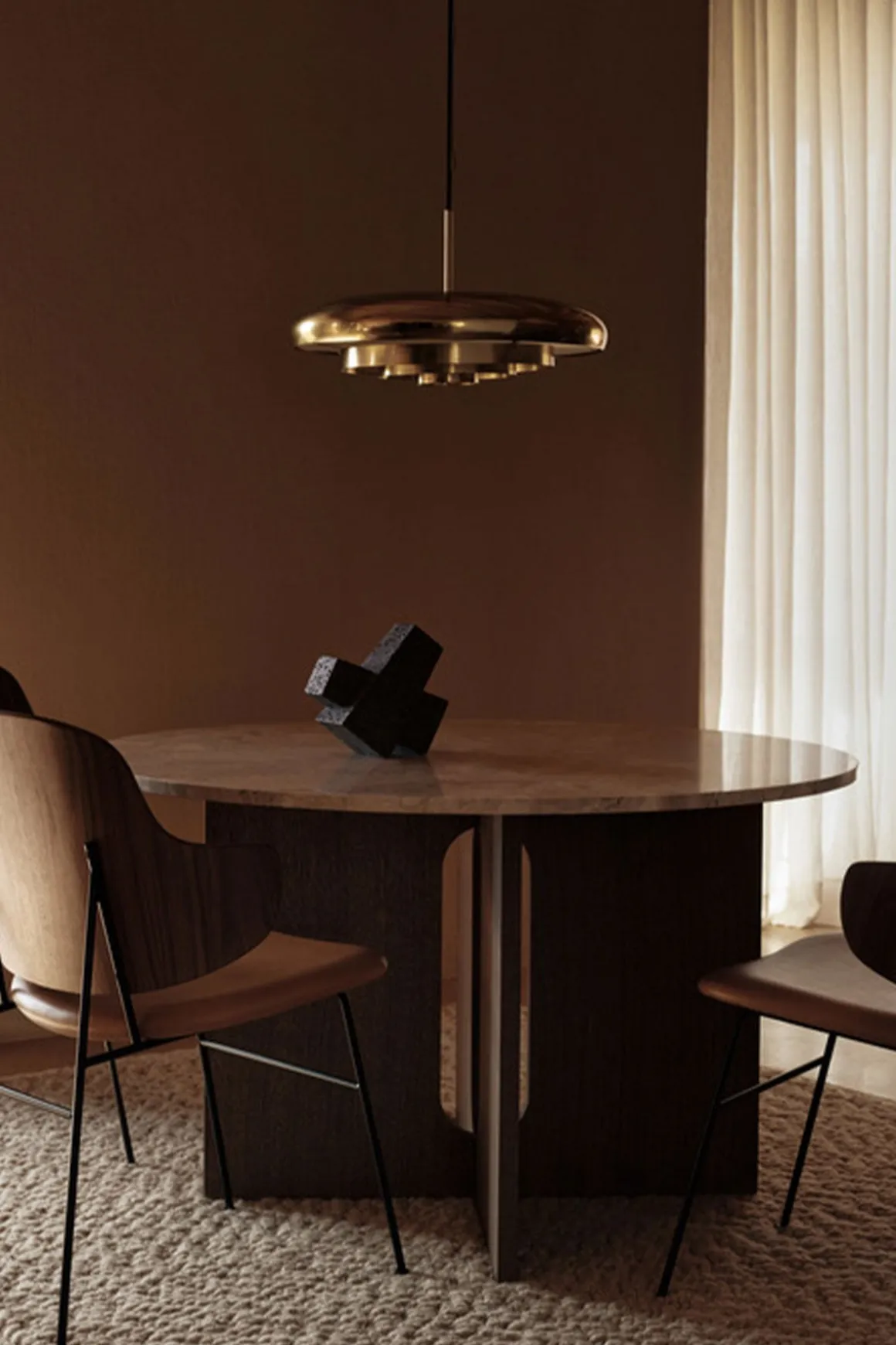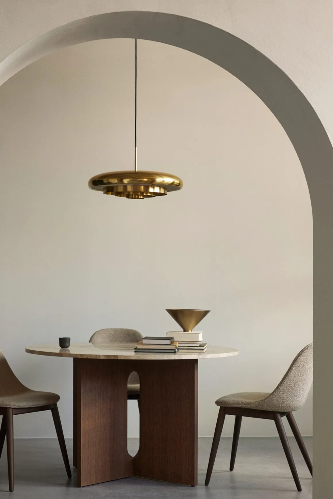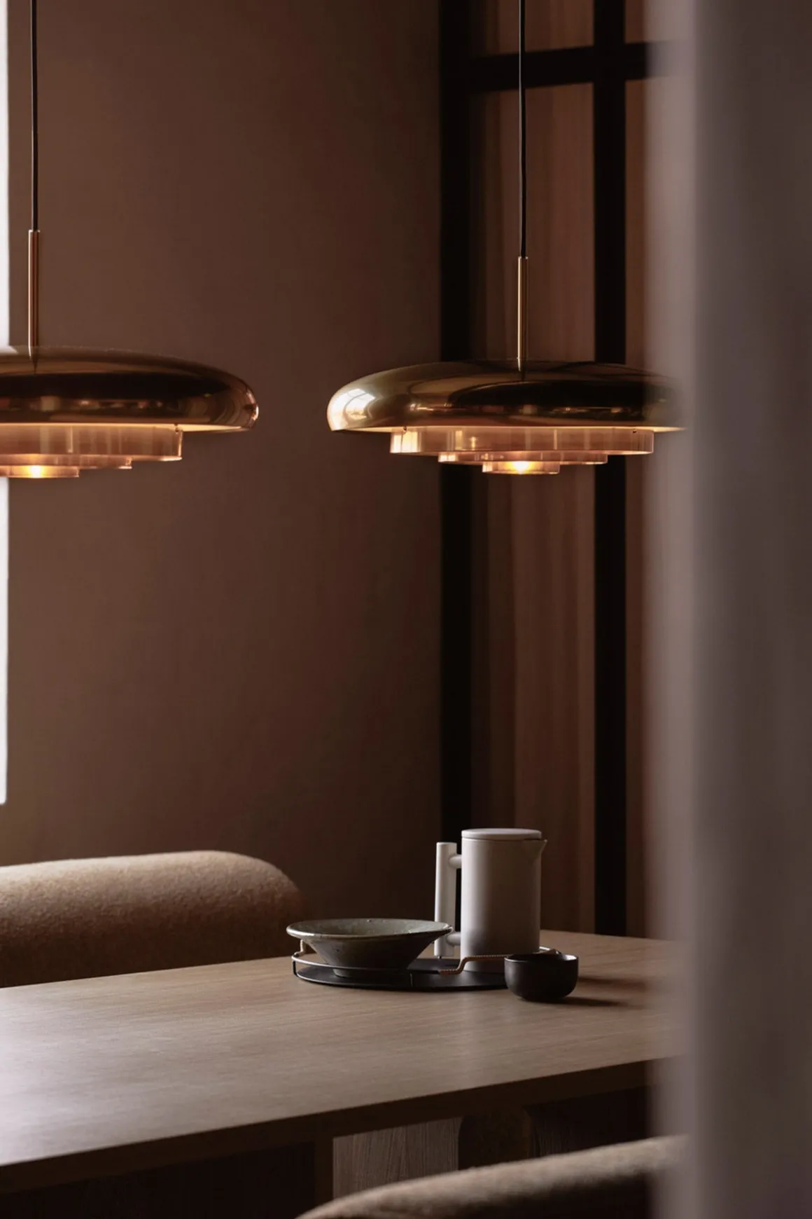 Resonant Pendant taklampe, designet av Alf Svensson og Yngvar Sandström på 1950-tallet. Resonant er like relevant i dag som den alltid har vært, og er både slående og enkel. Lampen er formet fra polert messing til fire konsentriske sirkler inni lampen som retter blendingsfritt lys nedover. Skjermen er laget i spunnet messing og detaljer i frest messing. Resonant er perfekt over spisebordet, kjøkkenøya, i stua, eller i trappeoppgangen, og det rene uttrykket gjør at lampen kan passe i mange miljøer og interiørstiler.