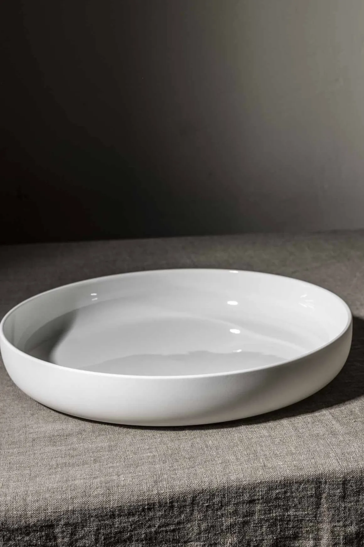 Stor Ildfast tallerken/fat med høye kanter fra Serax, designet av Studio Piet Boon. Tallerkenen har blank glasert innside og matt utside. Kanten på tallerkenen er avrundet oppover som gjør den svært allsidig til ulike retter. Base-serviset er enkelt med rent design som passer inn i ethvert hjem, og blandet med ulike typer servise. Kombiner med andre deler av Base-serviset for en fullført stil til bordet ditt.
