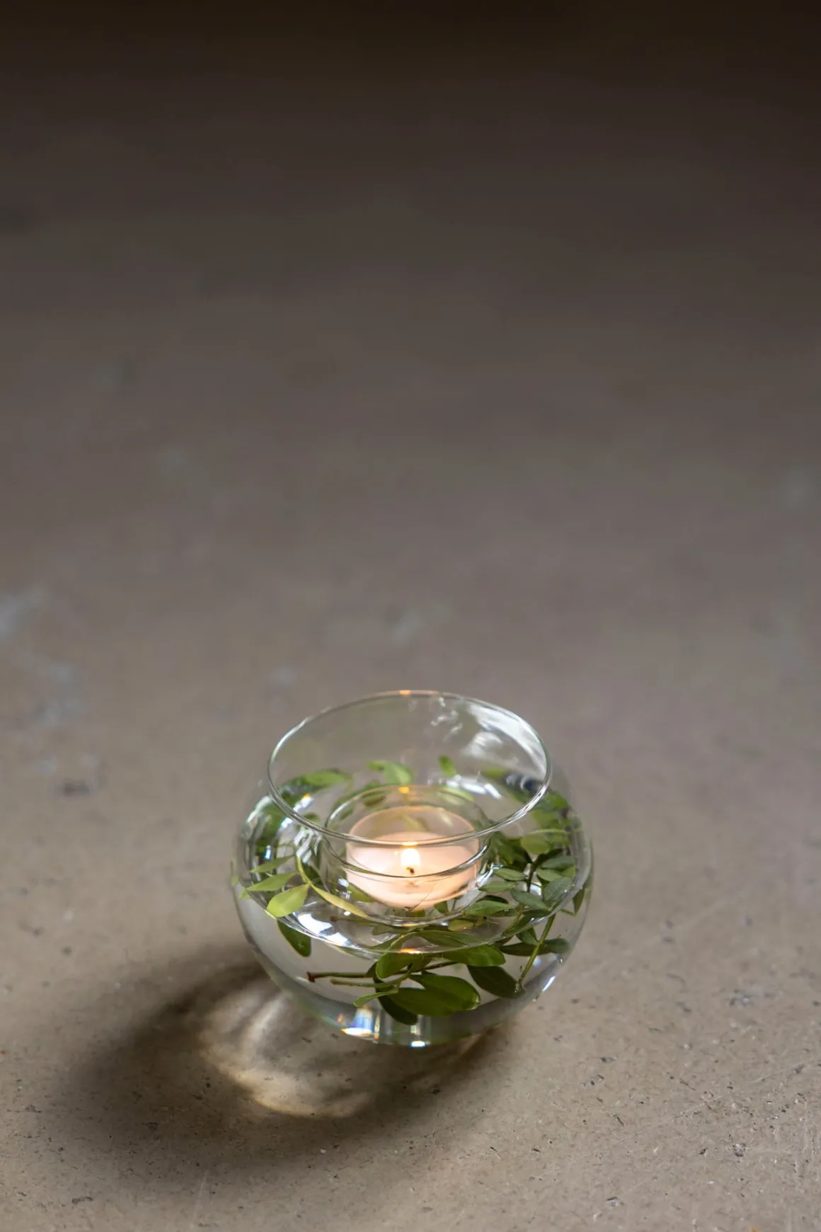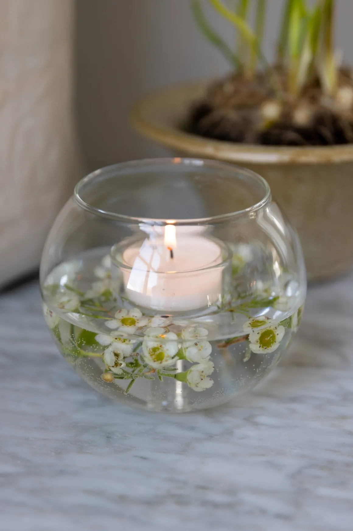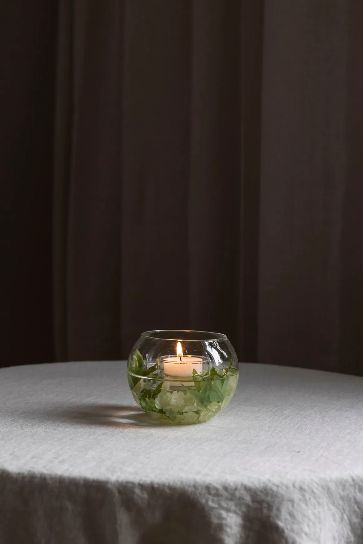 Populær telysholder av glass fra Serax. Den lille lykten er formen som en glassball med åpning øverst, hvor du kan plassere et telys. Fyll den opp med litt vann og dekorer med små blomster og blader, utrolig fin til høytider. Enkel og perfekt overalt i hjemmet.