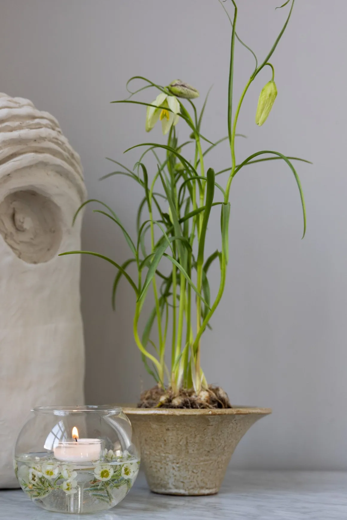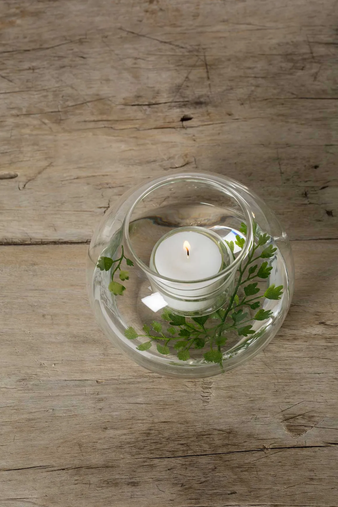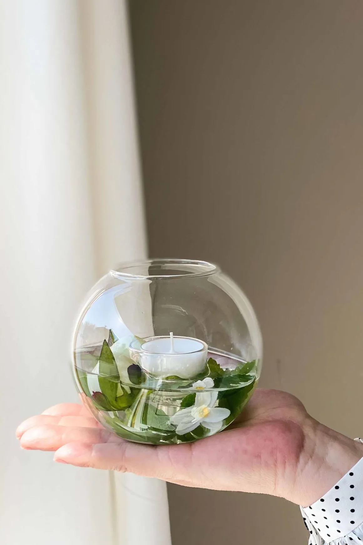 Populær telysholder av glass fra Serax. Den lille lykten er formen som en glassball med åpning øverst, hvor du kan plassere et telys. Fyll den opp med litt vann og dekorer med små blomster og blader, utrolig fin til høytider. Enkel og perfekt overalt i hjemmet.
