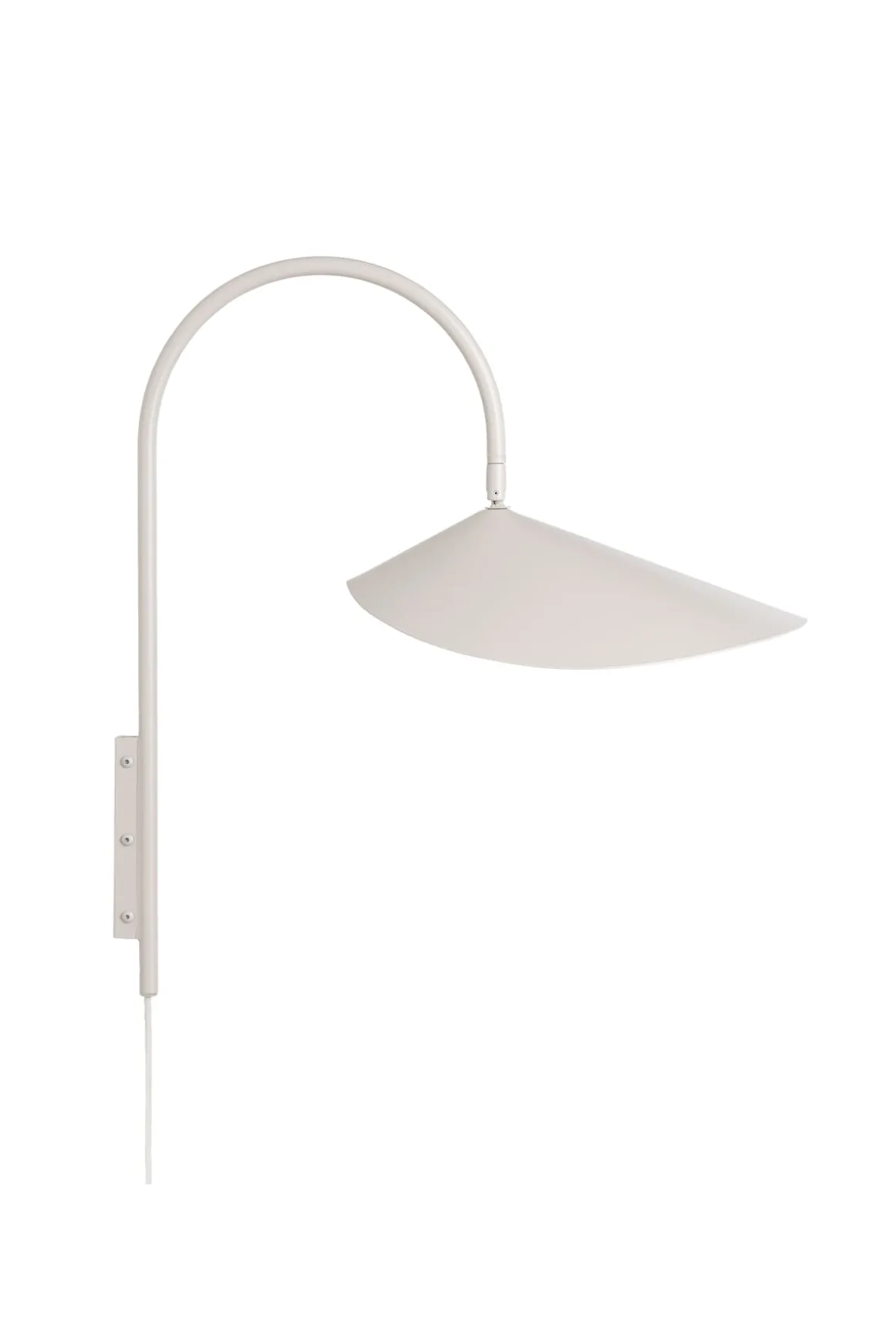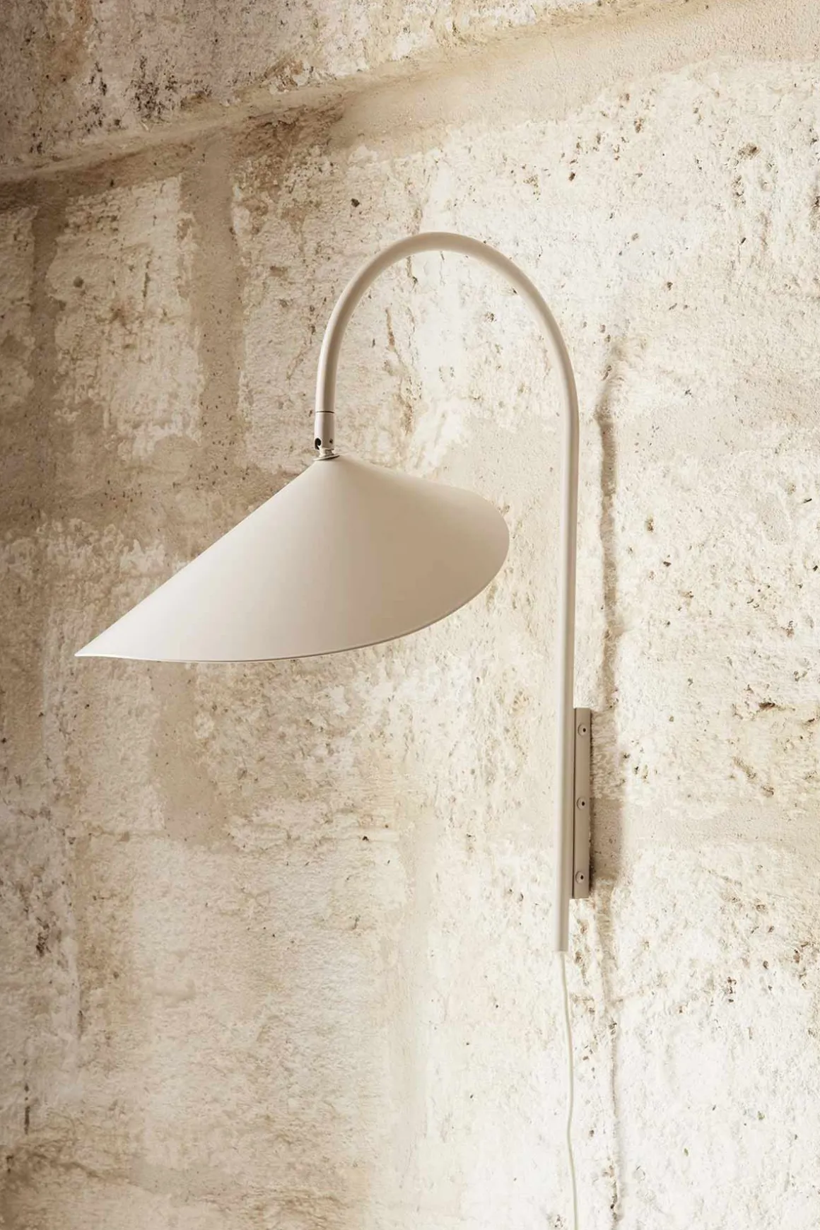 Arum Vegglampe fra Ferm Living skiller seg fra klassiske lamper med sin unike, naturlige form. Lampeskjermen ser nærmest ut som et blad hengende ned fra den buede metallbasen. Innsiden av skjermen er utført i matt hvitt, som gir et behagelig og jevnt fordelt lys. Skjermen kan justeres slik at du får lyset i ønsket retning. Enkel å montere med medfølgende veggfeste. Perfekt i stuen, et lesehjørne eller på soverommet.