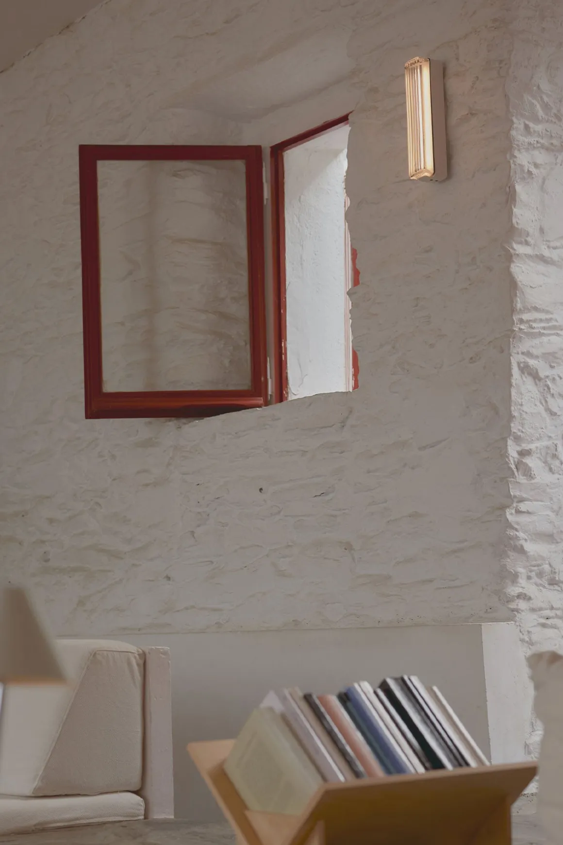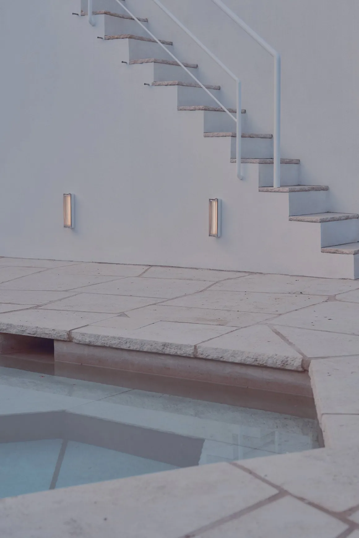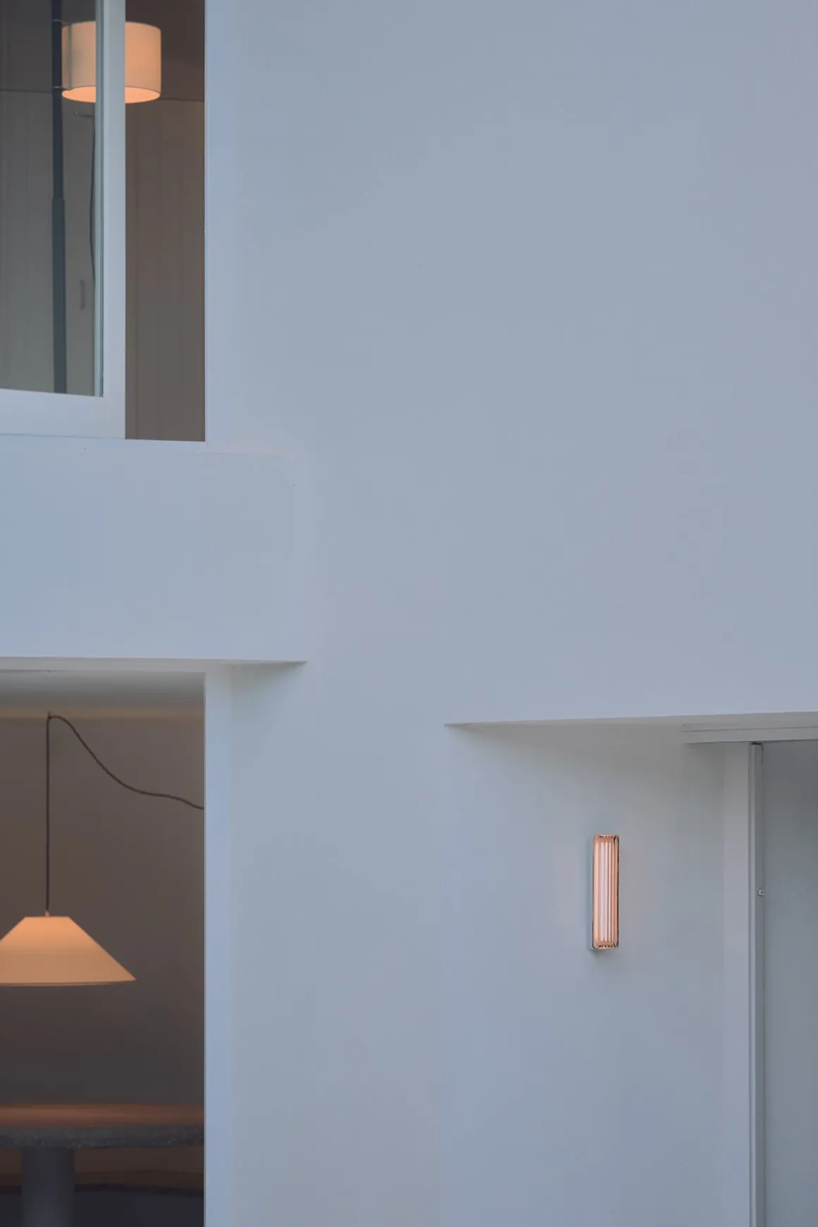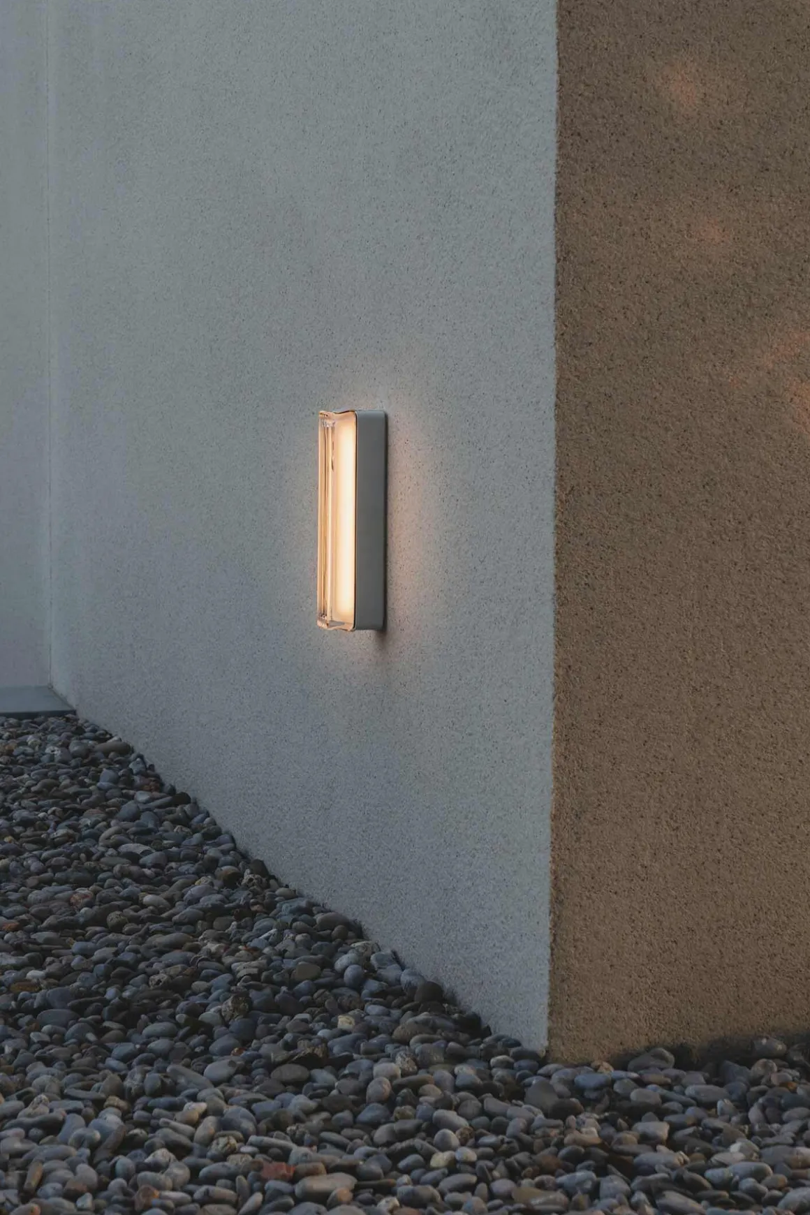 Estadio Singular vegglampe, designet av Miguel Milá for Santa u0026amp; Cole. En solid og minimalistisk vegglampe til inne-og utebruk i glass og pulverlakkert aluminium. Bruk flere sammen langs veggen i gangen, på badet eller ute på balkongen eller terrassen. Lampen kommer også i en hvit variant.