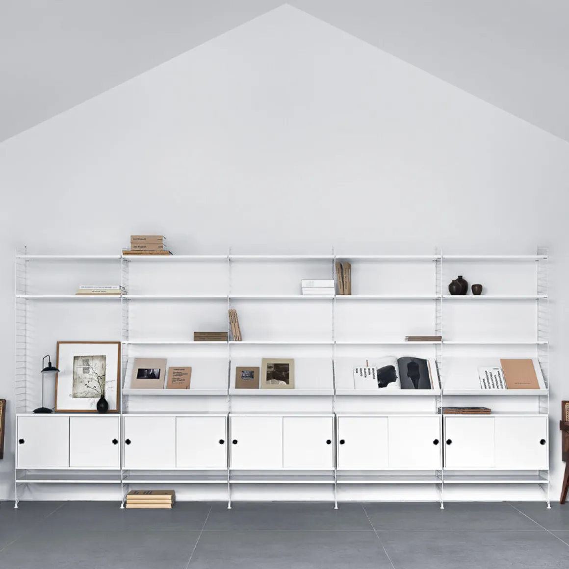 Stor veggreol i solid hvitmalt treverk fra string® system.