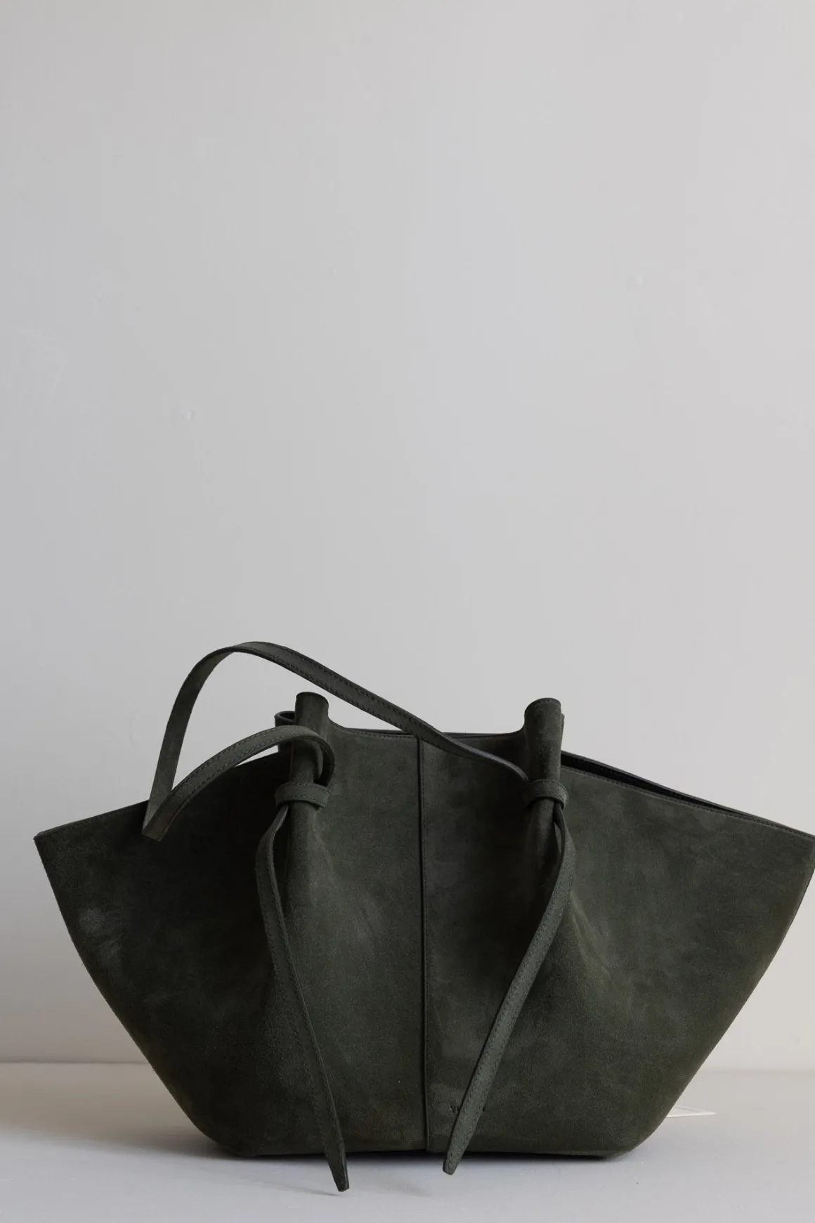 Mochi skulderveske i den største modellen i en nydelig grønnfarge – Birch. Den har de karakteristiske organiske formene, myke folder og knutedetaljer. Vesken er laget av eksklusiv italiensk semsket skinn, og har justerbare stropper som lar deg bære den i hånden eller over skulderen. Den lukkes enkelt med en magnet og har plass til alt du trenger i hverdagen.