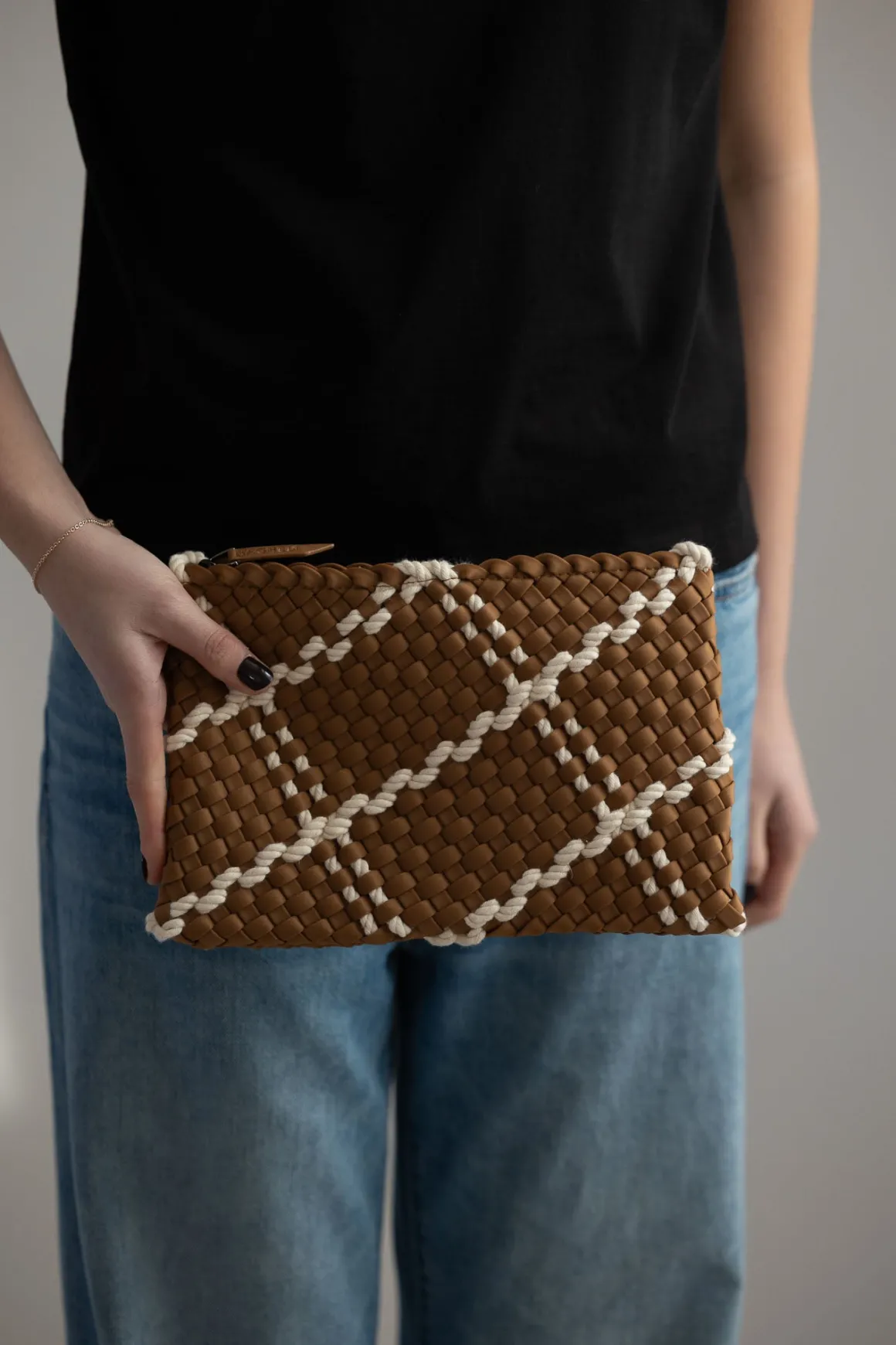 Sammensetning: håndvevd neopren (polyester) med steinkant i vegansk skinn